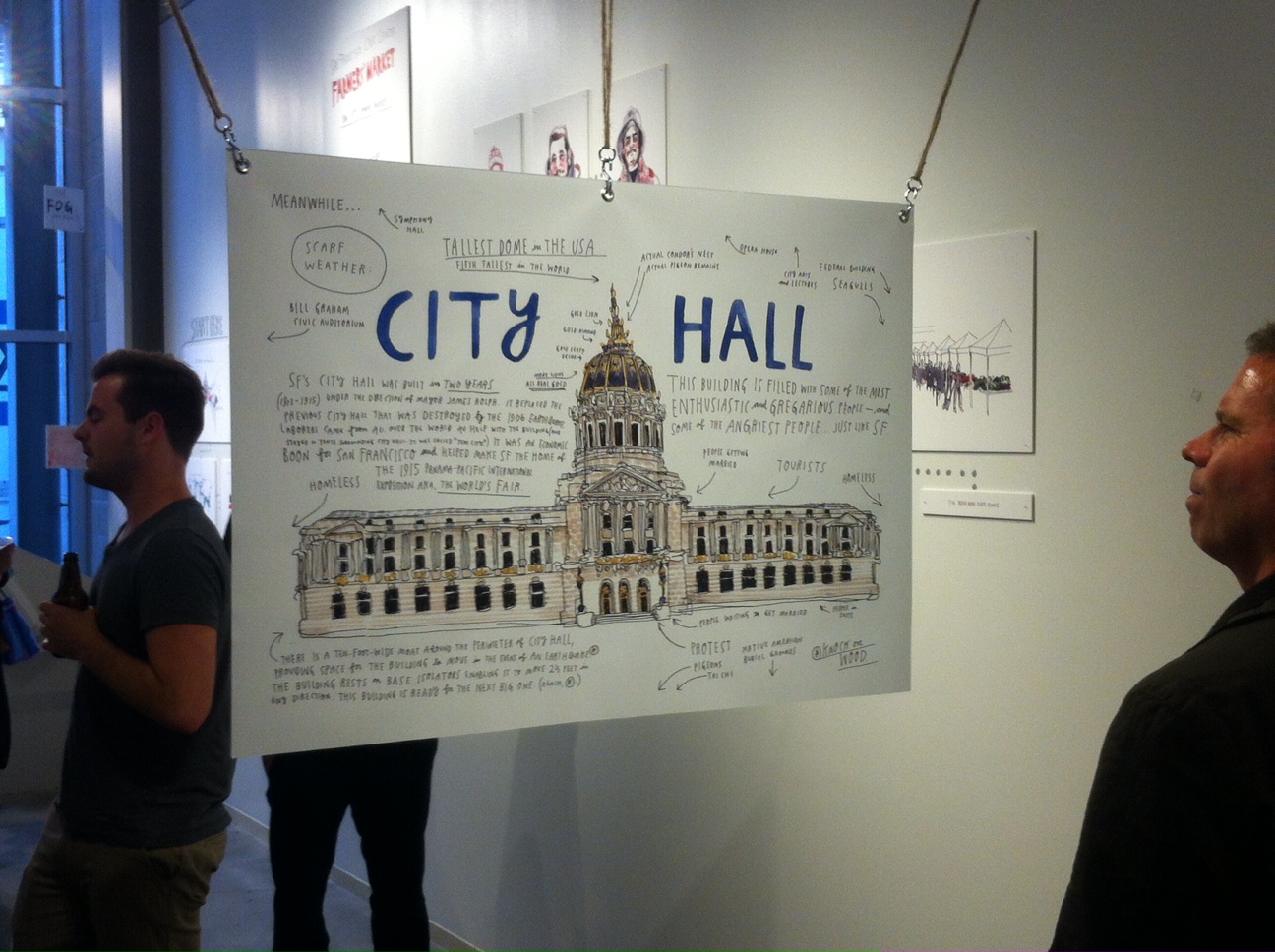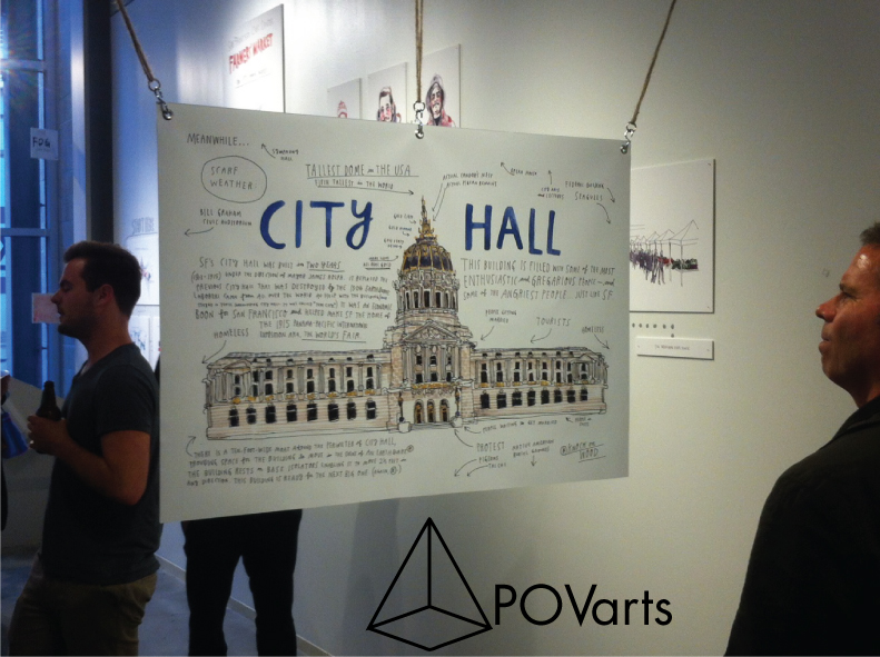“Meanwhile in San Francisco” is the show at SPUR to accompany the book by the same name, an “illustrated documentary” as the author, Wendy McNaughton calls it, of neighborhoods from around San Francisco. From the poor and destitute on 6th street – a street without any produce – to the hipsters in the Mission, where everyone apparently has a crush on the girl at the Tartine Bakery, McNaughton illustrates the stereotypes of the city. The show is laid out in neighborhoods and activities, one wall for Chinatown, another wall for the people who ride the bus, and another wall for 6th street. Little dots on the wall connect one image to another, leading viewers on a virtual tour of those areas. One of the problems is that the images are reproduced and scaled to fill the exhibition space without regards to the original drawing size. The result is disjointed, where some drawings are shown huge and other drawings are shown small. The speed of the drawings varies tremendously. Some drawings, all of which are watercolor and ink, tumble off the page in hurried gestures, while others linger with subtle variations in skin tone. At its best, the show reveals something about the city – something like “These are the people of your neighborhood”. At its worst, the show says nothing new about the stereotypes of the area. No good prejudice goes overturned or unchallenged. The poor are valiant in their poverty, recognizing that their community will soon be destroyed by waves of gentrification, and the hipsters are parodies of themselves, all trying to be unique, but all looking alike. Seeing McNaughton’s original drawings, and them delving deeper into the stories of the neighborhood to bring out the surprising and the unknown would have been a much more satisfying exploration of this great city, known as San Francisco.