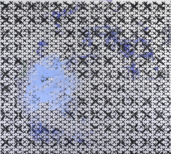 As I looked more closely at the individual works, I got a strong sense of humming in the background or foreground of each work. In fact, there is no clear distinction between foreground and background in the works; rather they are generously and densely layered with swaths of paint and repeated patterns of ready-made marks, without a sequential need for which came first or which should be given visual primacy. The layers are distilled enough to identify the different images, colors and patterns, but none are really preferenced in the paintings. Some, like Ω, are more like static or white noise – layers melting into layers without any elements popping out, while 🙂 comes close to noise that cannot be distinguished – a highly abstract sea of marks.