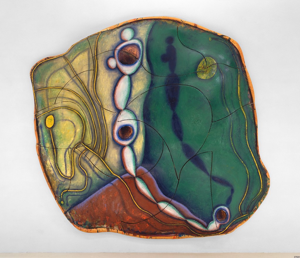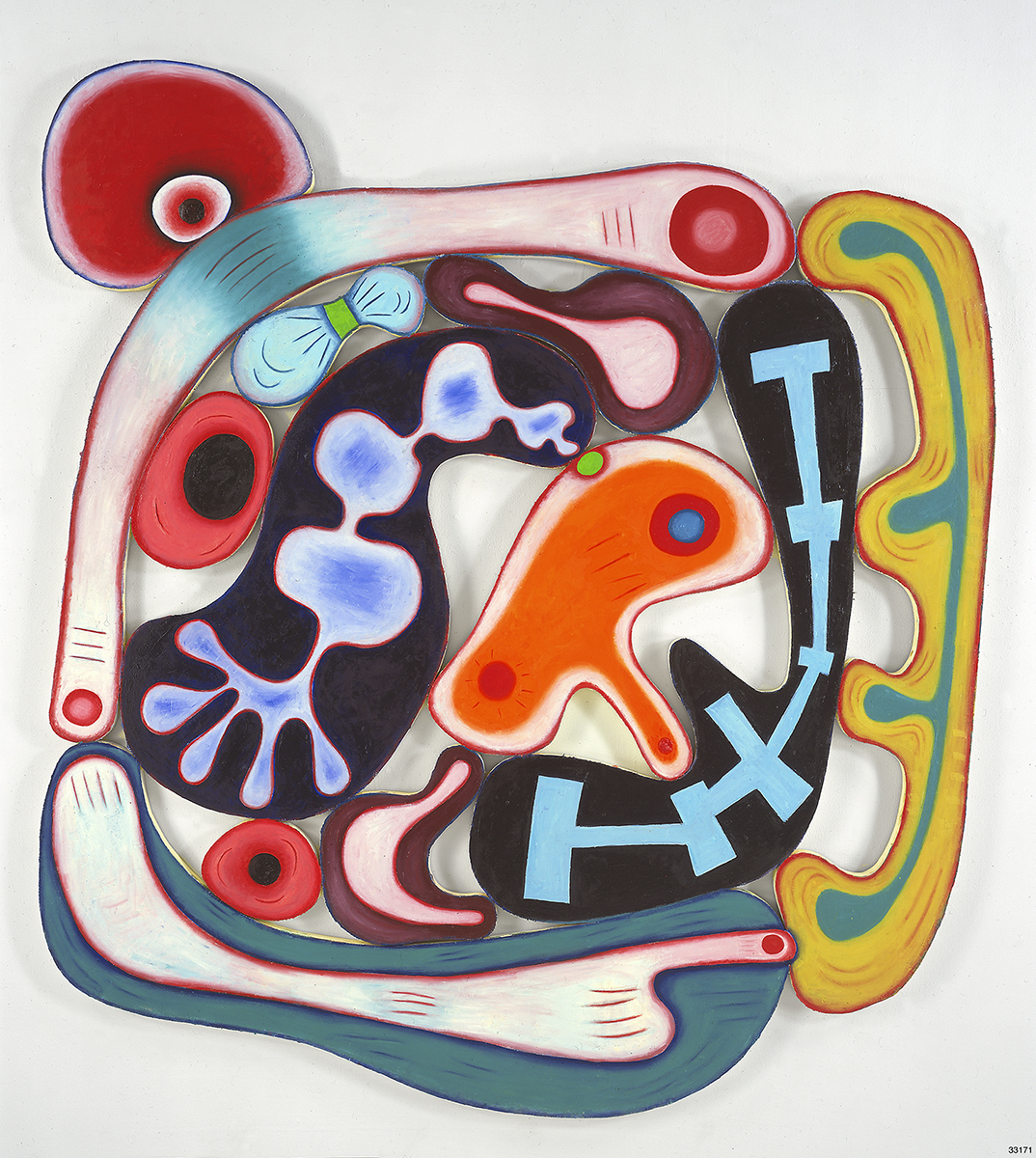 Murray painted shaped canvas with “bloopy” forms (her own delightful word), domestic objects and body parts (mostly internal). She dealt with subjects that sometimes were and still often are considered taboo – domesticity, fecundity, corporality, sex. The objects she employed in her paintings exposed the veracity of what real life embodies. But this idea and these subjects did not dominate her paintings; her message was more that you can look for the happiness in life without neglecting to acknowledge the plain necessities. The work was always expressive, intensely chromatic, and vital. She danced the shapes and objects around and through the canvas, taking the viewer on a wonderful and wacky journey.