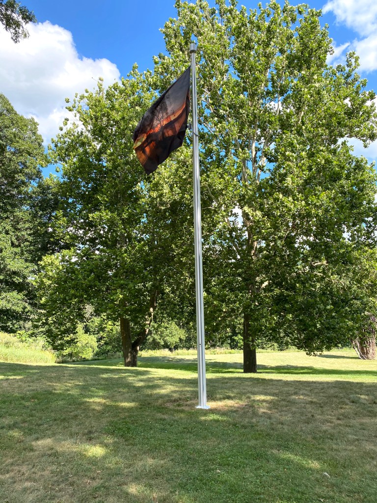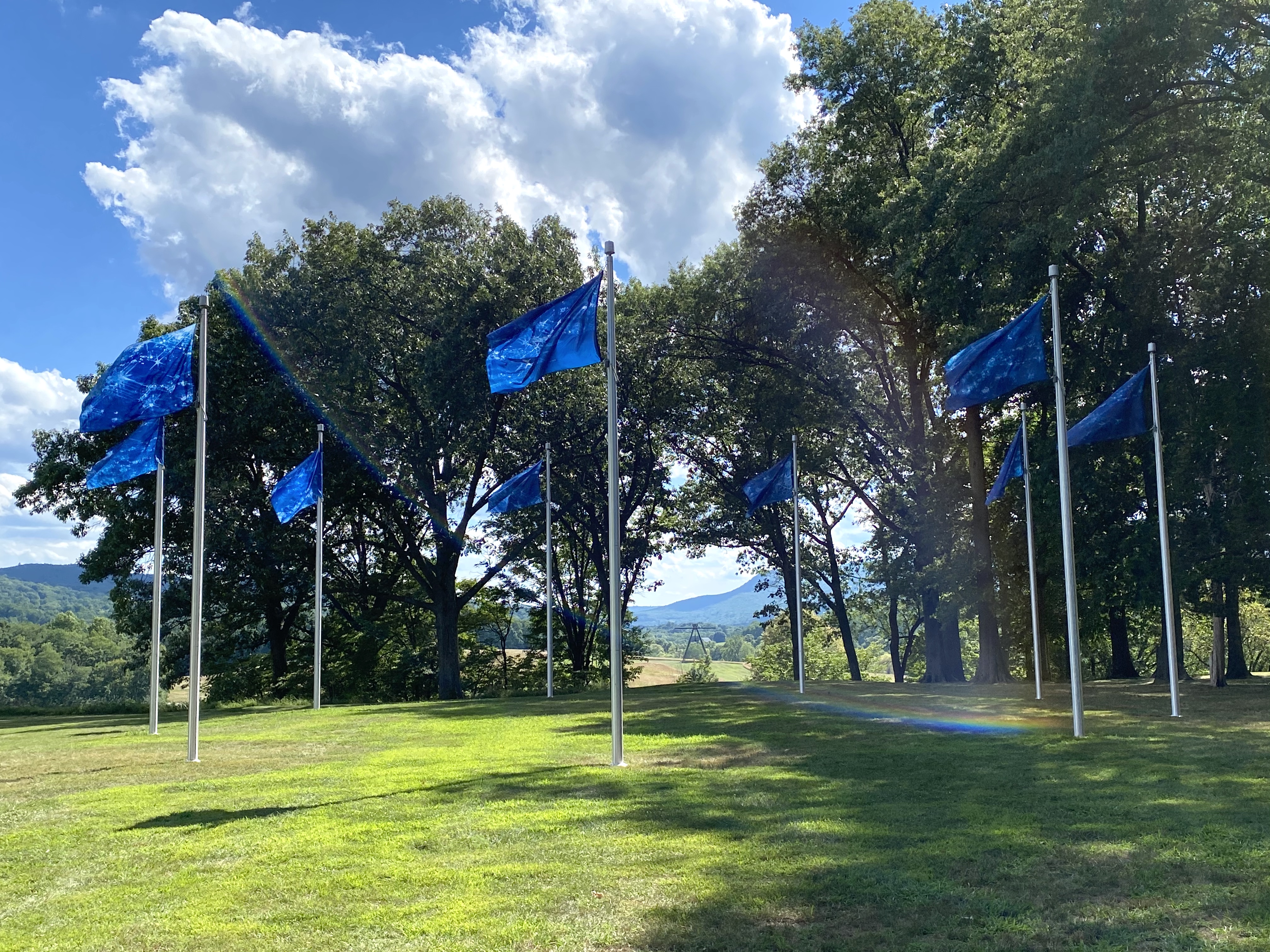 Kiki Smith’s River Light (2020), sits high on the Museum Hill right outside of the Museum Building, which is the main gravitational hub of Storm King. Nine cyanotype* printed blue flags, made from plexiglass etchings of photos of sun glints on the East River, fly in the wind atop stainless steel poles. They are arranged in a ring and while each one is unique, when seen together their difference is minimal and they feel like a coordinated allegiance to some esteemed and mysterious entity. Made a year before our current political upheaval and frequent national protests, this work can’t help but feel like an alternate option that offers reflections from daily contemplative walks along the East River in Manhattan. Smith’s other work, Hudson River (2020), is more varied in its chromatic range and presents a single flag flying with an image of a color-saturated sunset along the Hudson River. Combined, these two works create a bridge between Downstate and Upstate New York. Smith’s work elegantly captures sunlight at different times of day along important New York waterways. Even in her direct approach, Smith maintains a mystery in her work, but it is one largely provided by nature and celebrated by the artist for us to observe and enjoy.