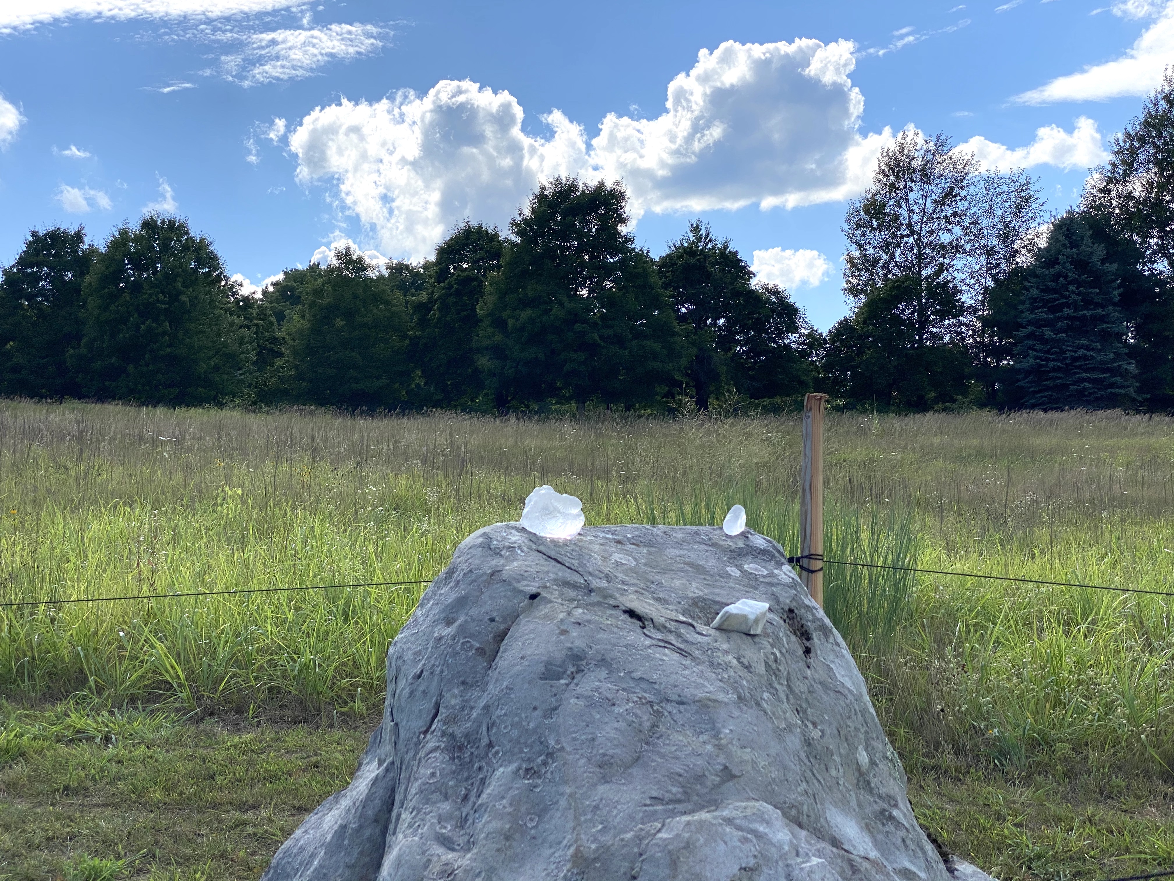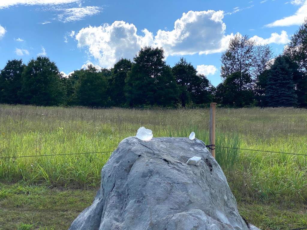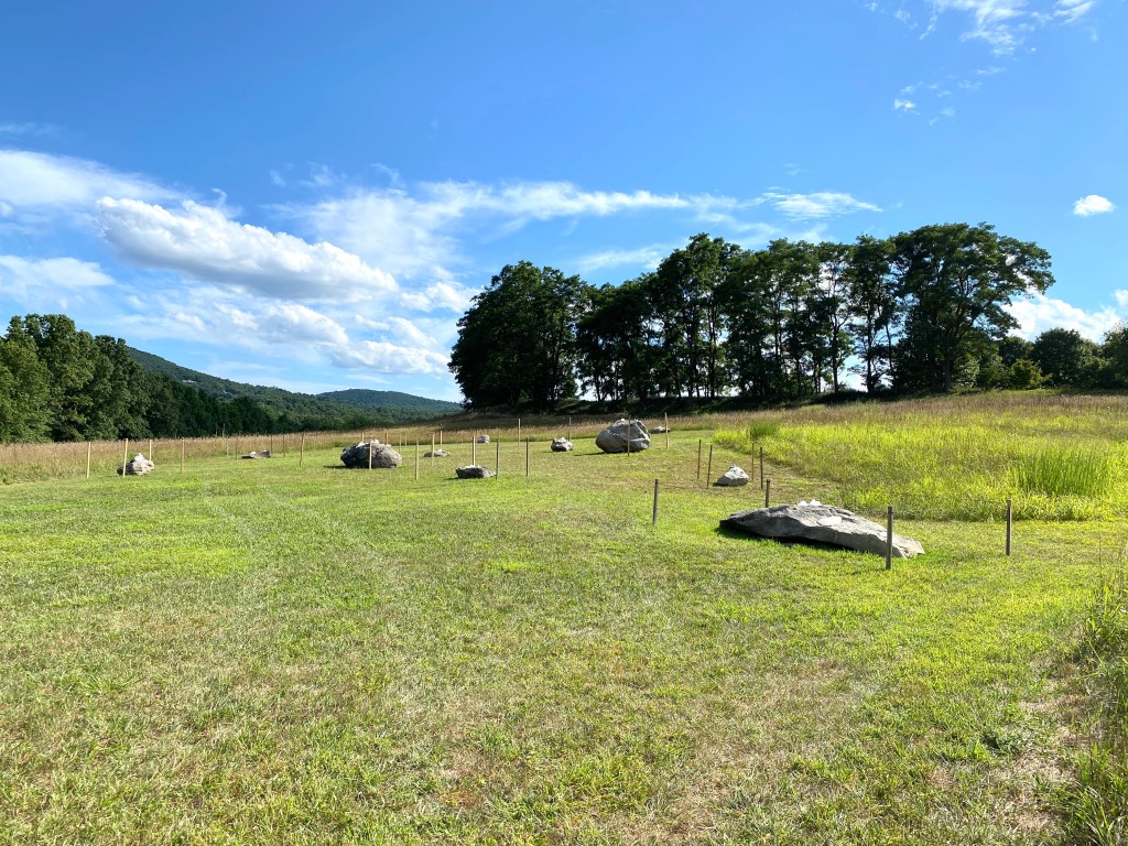 Martha Tuttle’s exhibition in Storm King’s Outlooks (part of a series featuring emerging and mid-career artists) really requires you to search to find it, to seek it out: at the very end of the property where the sound of the cars driving along I-87 can be heard. Even the audio guide shares the artist’s perspective in a whisper, lulling the listener into a quiet mental space. Tuttle’s site-specific project is entitled A stone that thinks of Enceladus (2020). Tuttle writes a series of 23 brief statements that give us a clue about the depth of her philosophical inquiry into the nature of the land, the solar system, and our connection to the earth. These statements are informational and poetic. The work itself is composed of several large boulders dotting an amorphously mowed field. The boulders are roped off with wooden stakes and string, making them feel like archeological dig sites. The boulders have a stacking of rocks and glass sculptures cast from rocks with all their cracks, crannies, and imperfections. Cairns come to mind, as does the Japanese aesthetic of Wabi Sabi, an approach to art and design that emphasizes the acceptance of transience and imperfection. Asymmetry, roughness, and simplicity are also virtues of this work. Unlike Smith’s more direct approach to the prompt of making art to be seen in nature, Tuttle forces us to meander, squat, bend, and look from multiple angles before we are rewarded with beautiful and profound visual moments. Circling back to the title and story of Enceladus, not only is he the mythological giant offspring of the earth and sky, but it, personified in a moon, is also the most reflective in our solar system, making Enceladus a fitting beacon for sending and receiving light as an affirmation of existence as Tuttle proposes for us to ponder in this work.