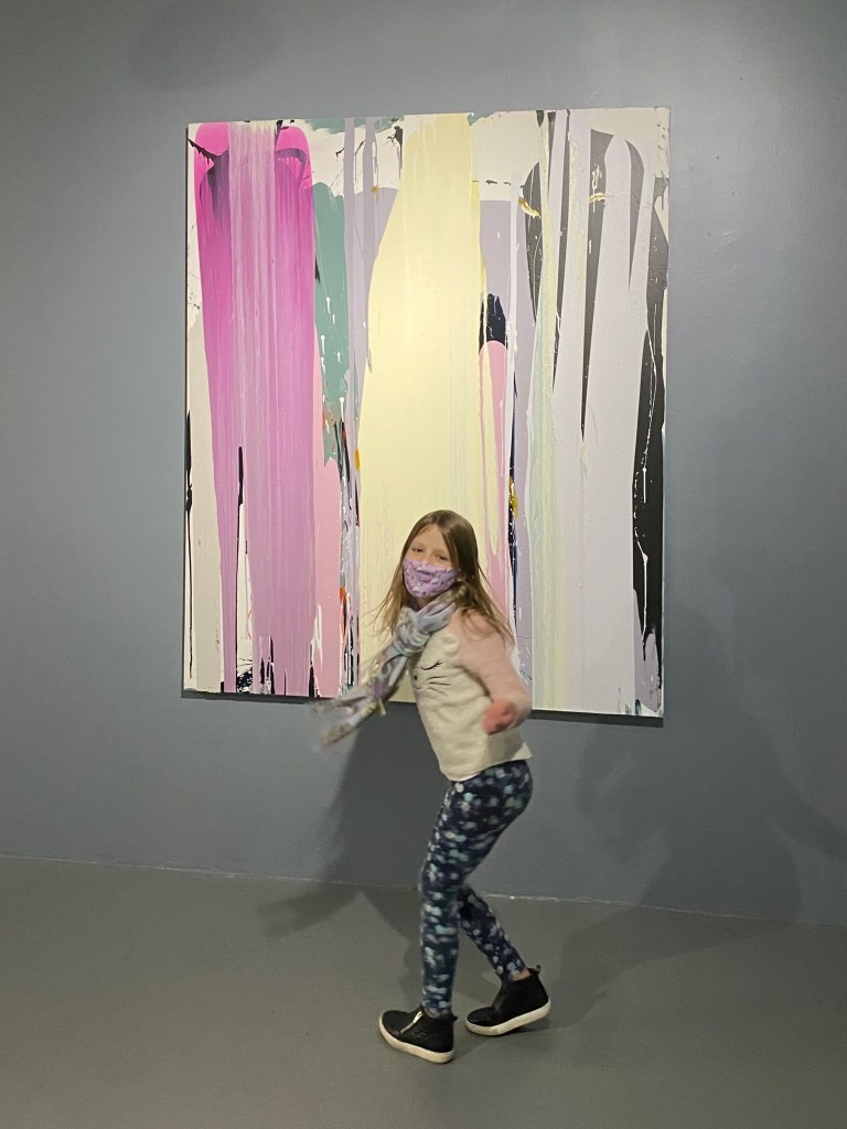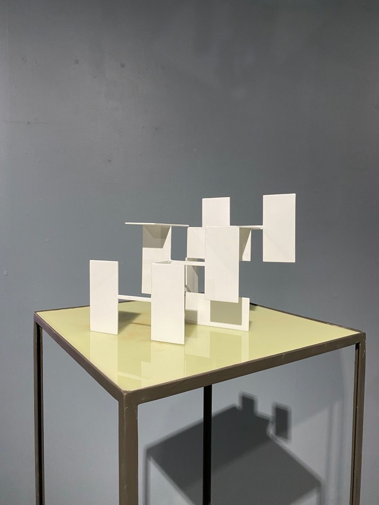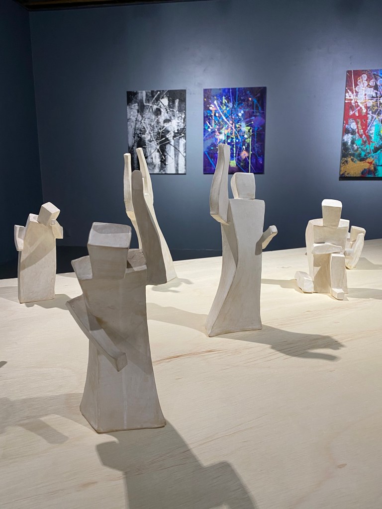 Thickly textured, and energetic overall compositions show themselves in Kathleen Maximin’s spatially complex acrylic painting, making me wonder about the tool used by the artist to achieve the recurring vertical and horizontal hatch marks. The sculpture groupings had a nice relationship to one another, in that they were all of a tabletop size with a bent towards angular geometry. Though the narrative pitches were different, both leaned towards the miniature, Gunnar Theel’s steel metal sculptures appear as architectural inquiries or models with negative space playing a central role in the streamlined elegant compositions.