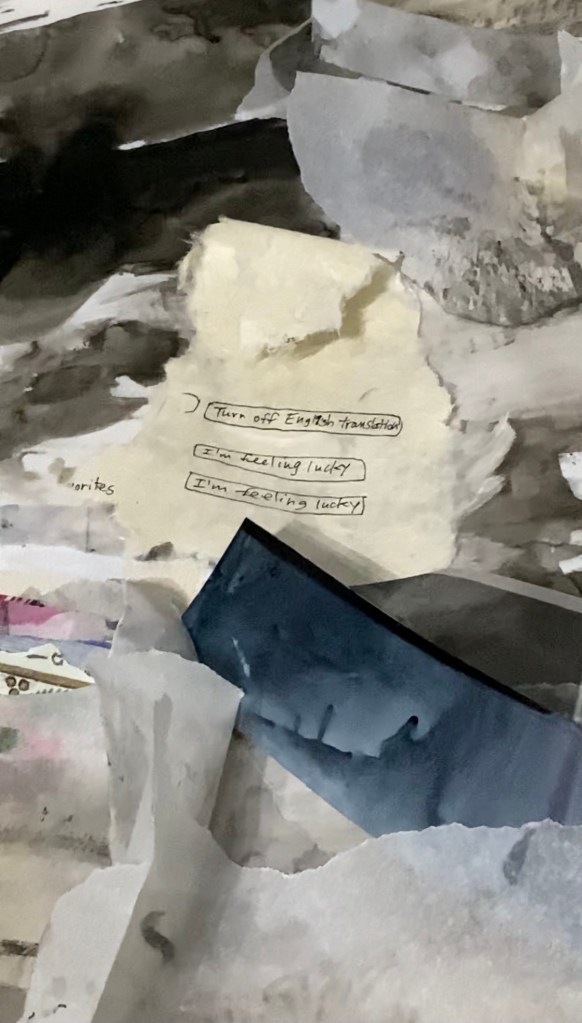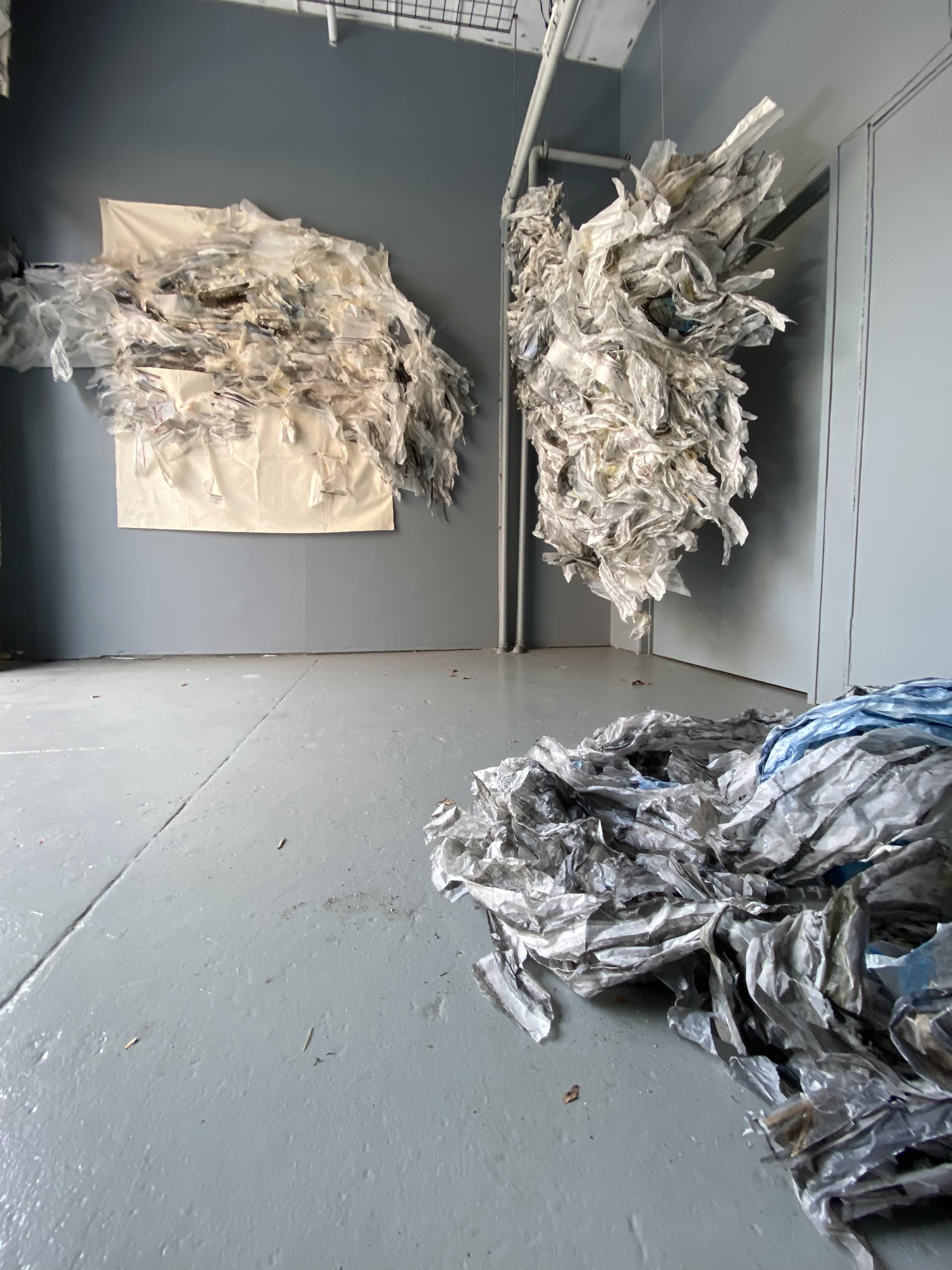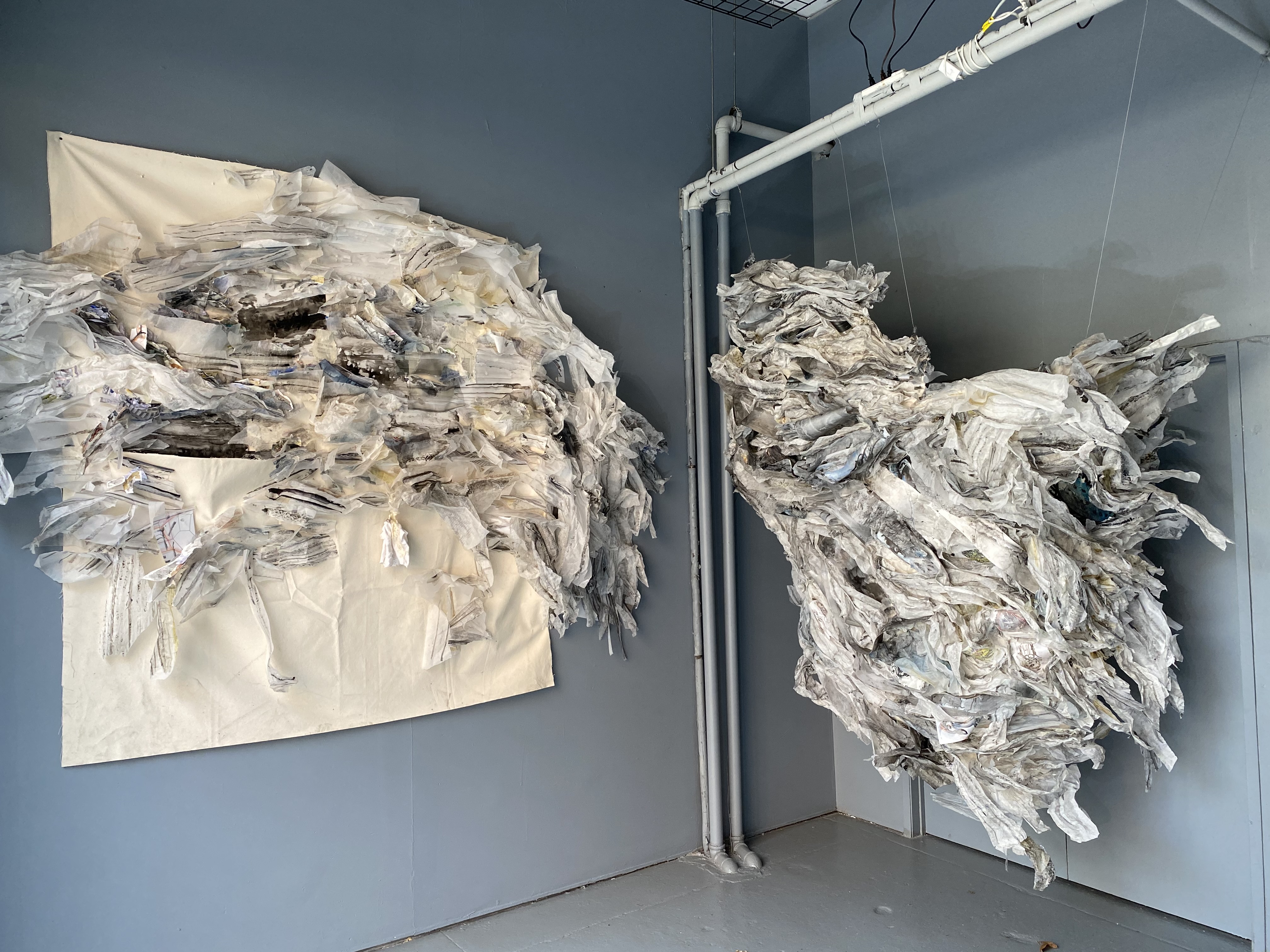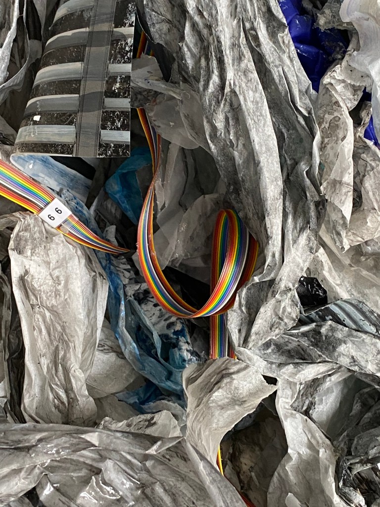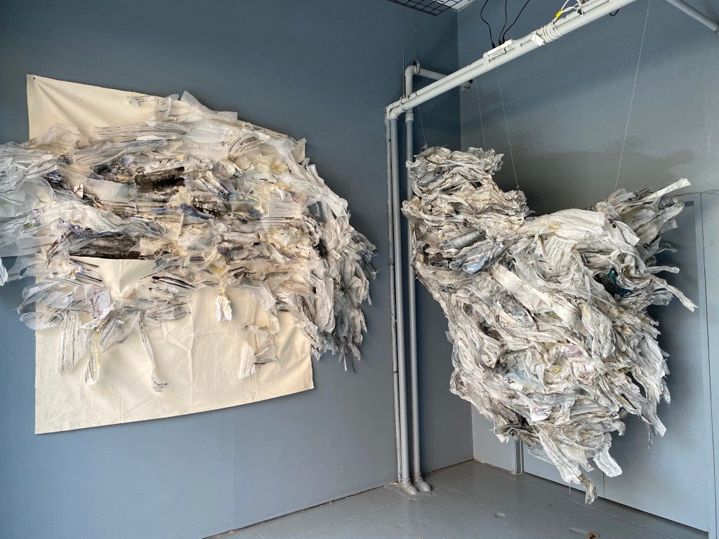 The dictionary definition of the maelstrom is a powerful whirlpool in the sea or a river. It can also be a state of confused movement or violent turmoil. And in this case, both of these descriptions resonate because the work has an organic life force through the sheer ambitious assembling of pieces of paper and plastic, crumpled, ripped, cut, and adhered together. Overlaid on all of this is a range of drawing, collaging, painting, and writing. There is a lot of care and tenderness with which all this chaos and fragility are hung together and articulated. The continuity and tendrils of these out-reaching chromatic grey clusters form a megastructure that feels weightless and heavy – perhaps a paradox, perhaps a balance. My favorite moments are the oscillation between seeing forms that grow into large consuming clusters on the wall and finding moments of the artist’s written notations and daily experiences such as “Turn off English Translation, I’m feeling lucky, I’m feeling lucky.” We get a bird’s eye view of the artist’s mind and intimate studio practice. It’s finished but not overly polished, it’s a raw, visceral, and porous experience. Seeing striated rainbow ribbon cables running through the sculptural component on the right hand side closest to the doorway is a surprising break from the overall tonal greys in the rest of the exhibition. Upon closer inspection, it registers as some kind of computer technology – a departure from the more familiar and analog papers and plastics. The chromatic boldness and the density of the ribbon called to mind the pulsating through-line of digital technology in contemporary life: the connectivity of almost everyone through the internet. Like social media, the digital cable feels both exciting and invasive, like an unnatural vine creeping through the work in a beautiful yet intrusive way that parallels how technology interrupts our physical and psychological spaces.