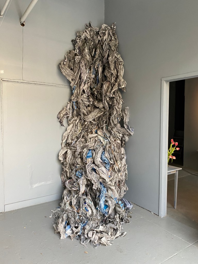 Intending to write only about Yaniv’s work, I started my gallery visit in the front space where the artist has created an installation with her sculptural mixed media work hung on the walls, wrapping around corners, nearly reaching the ceiling, and cascading to the floor. I was fortunate to see this exhibition both in a darkened room illuminated by spotlights for a dramatic effect, and when the metal roll door was lifted, seeing both the street view and inside view with natural light. The darkened view is quite stunning as there’s a sense of theatricality and otherworldliness because the concrete architectural reality of the space recedes into the less visible background. The second sunlit view becomes much more of a conversation between the work, the space, and the world outside of the gallery. This may resonate with Yaniv’s interest in showing how artwork can merge with lived life and the space of the viewer. At first, it’s a little disorienting because it’s hard to understand what I’m looking at – in a good way though. All the similarly toned but diverse materials merge together to create a cluster of form and texture. The artist’s techniques reveal themselves slowly, drawing marks, paint applications, general assembly, and the seeming gravity-defying weight of the sculpture. As soon as I walked into the exhibition, the word Maelstrom came to mind, unclear if it emerged in response to the experience or came from a recollection of the title of the show. (I always try to read press releases after seeing the work on view.)