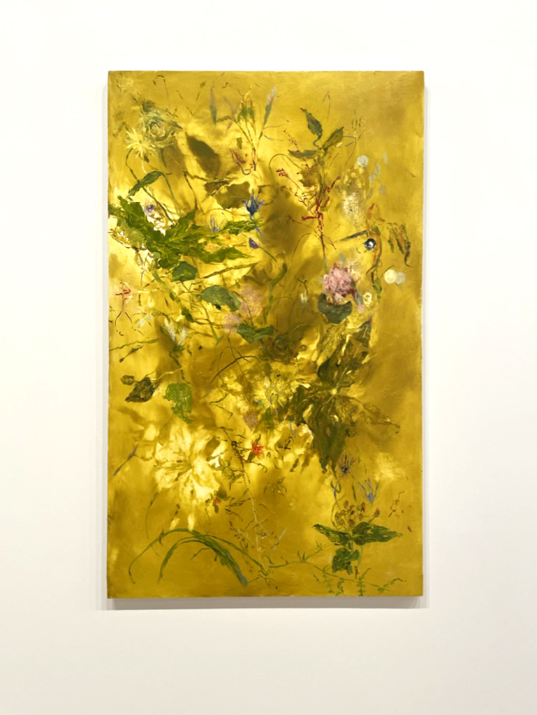 All of the works in the show are figural: either of a human figure or of flowers as symbols of remembrance, honor, and mourning. And they all relate to the experience, a direct depiction, or portrait of a Black person, whether a figure who was killed by police violence or, someone unknown to the viewer, perhaps a friend of the artist’s. Each work has a feeling of memorialization, a tinge of sadness, and a depth of humanity that fills the figures with solemn reflection.