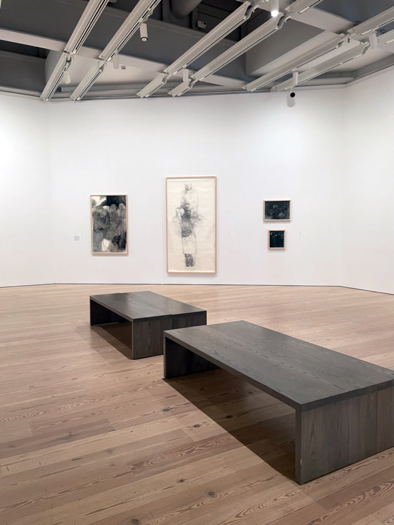 Packer is seemingly a virtuoso with charcoal. My co-visitor, another artist, and I remarked that this might be the most facile and gorgeous use of the media we could recall seeing in contemporary work. There are a number of charcoal drawings on paper, and charcoal lines are also visible in many of the paintings.