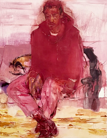 Leaving some of that visible allows the viewer to feel privy to something more intimate in the artist’s process. Paint is loosely or thinly applied with a variety of brush sizes and opacities in individual works so that both finished and unfinished elements exist together and heighten the viewer’s engagement with the piece. Line too plays a large role so that the figures, forms, and space are often suggested by a simple line or gestural mark.