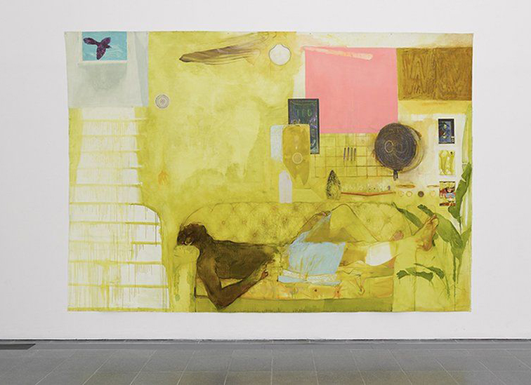 On stepping off the elevator, one is met with a very large painting entitled Blessed are Those Who Mourn (Breonna! Breonna!). It presents part of Breonna Taylor’s home, based on various photographs that emerged after her death. Filled with yellows and greens and a solid pink square in the upper right quadrant, the painting depicts a domestic scene that feels both intimate yet also very regular. Packer includes various objects that she, or any viewer, would likely also have at home, drawing a connection between Taylor and the artist or the viewer, and highlighting Taylor’s own humanity. The sole figure is lying on a sofa, one leg bent, one hanging over the sofa’s left arm, enjoying the comfort of being in the privacy of home. This security makes even more poignant the violent invasion of Taylor’s private space that we know is to come.